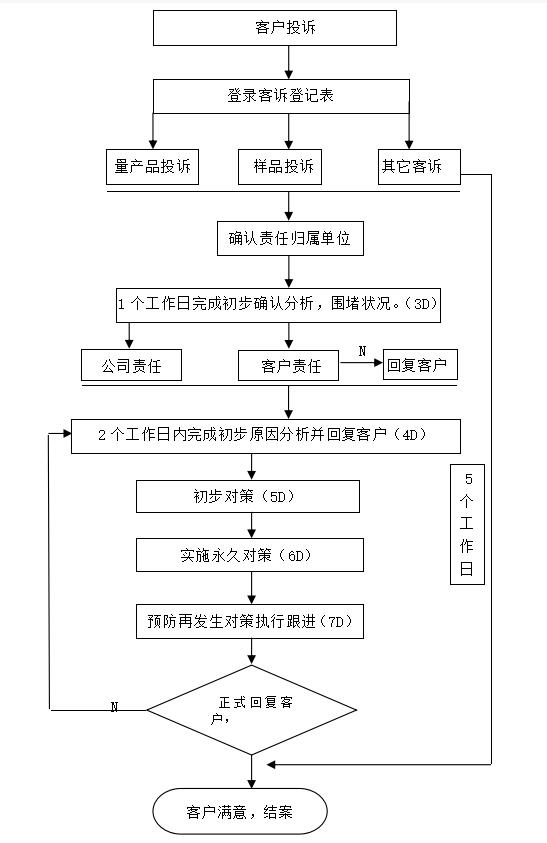 品证部 、市场部、技术部负责客户投诉的接收,通知并协调相关部门完成投诉处理工作。客诉流程如下: